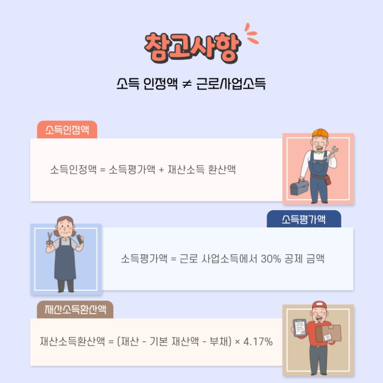 하지만 자신의 정확한 중위소득을 알고 있는 분들이 많지 않아요. 중위소득은 소득과 재산을 합산하여 소득인정액으로 계산하는데 직접 계산하는 데에는 어려움이 있답니다.