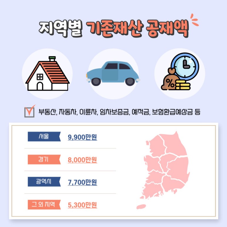 또 중요한 선정 기준인 중위소득은 일반적인 소득 외에도 보유한 자산까지 포함한다는 것을 잘 알아둘 필요가 있는데요. 정확한 용어로는 소득 인정액이 적용됩니다. 즉 소득이 어느 정도 많다면 당연히 받기 힘들지만 소득이 낮더라도 보유 자산이 일정 기준 이상으로 과다하다면 선정되지 못할 수도 있다는 의미가 되겠죠. 하지만 기본 공제 항목이 있는데 이는 지역마다 다릅니다. 주요 지역을 예시로 들어보면 서울 9,900만 원, 경기 8,000만 원, 광역시 7,700만 원, 그 외 지역 5,300만 원의 공제가 적용된다는 점 참고 바랍니다.