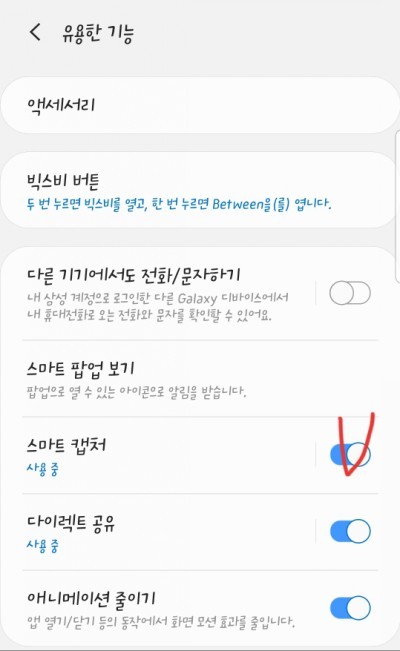 손날 밀어서 휴대폰 핸드폰 캡쳐하는법를 하시기 위하는 것은 휴대폰 설정 메뉴에 접속하신 후 '유용한 기능'에서 '모션 및 제스처' 메뉴에 접속해요. 여기서 '손으로 밀어서 캡쳐'를 촉진 해주시면 손날을 이용한 캡쳐를 하실 수 있답니다.