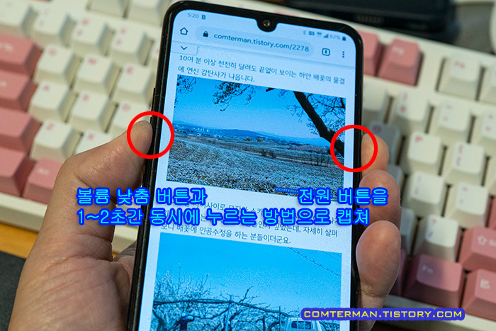 폰의 전원 버튼과 볼륨 다운 버튼을 또한 눌러 화면 캡쳐를 수행해요.